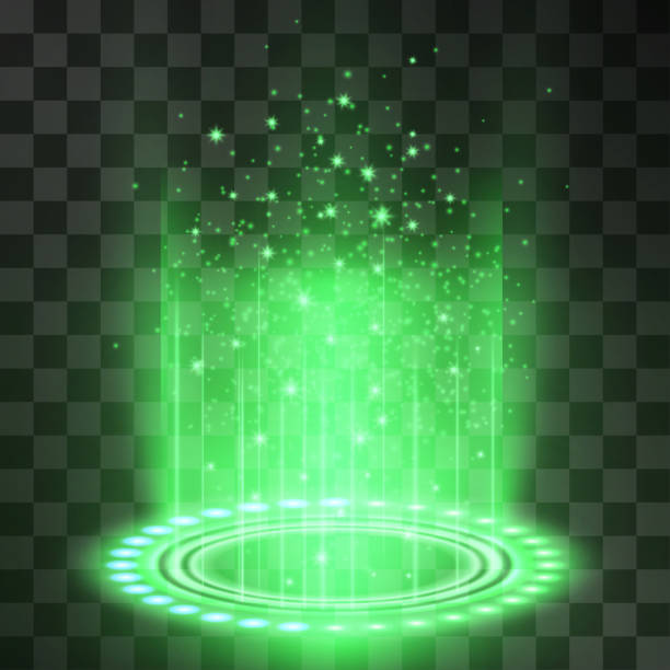 Futuristic gree neon light portal, crown shape laser cylinder light with glowing sparkles on transparent background. Magical glittering stardust illumination. Blinking energy stream. Hologram station.